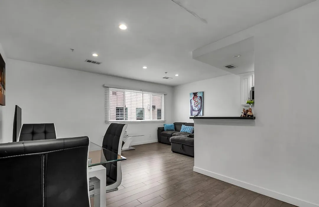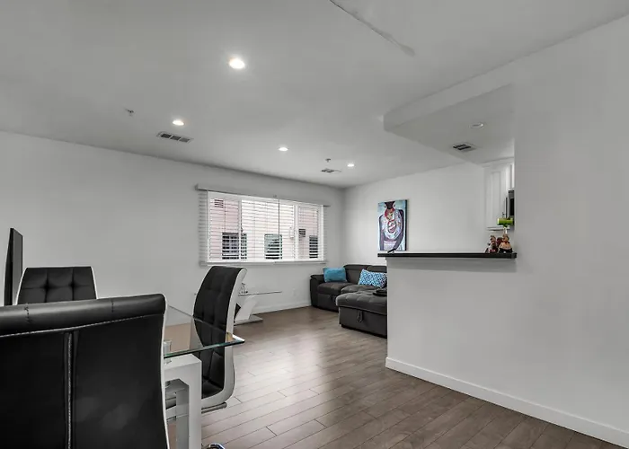Modern 1-Bedroom Apartment Dining Area Free Gated Parking Central Los Angeles offers convenient self-catering facilities, including an equipped kitchenette with coffee and tea making machines, a refrigerator, and an oven. The nearest bus station Melrose & Normandie is merely a 5-minute stroll away.